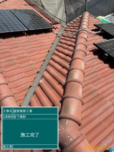 太陽光パネル周辺や谷樋(たにとい)付近など、全体的に瓦の並びを点検し、隙間やズレが生じていた箇所を正規の位置へ調整いたしました。雨水がスムーズに排水される状態に復旧しております。