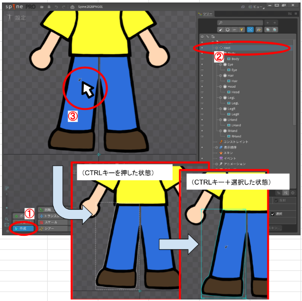 ボーンは画像パーツ(スロット)を操作する際の骨格、軸となるものです。